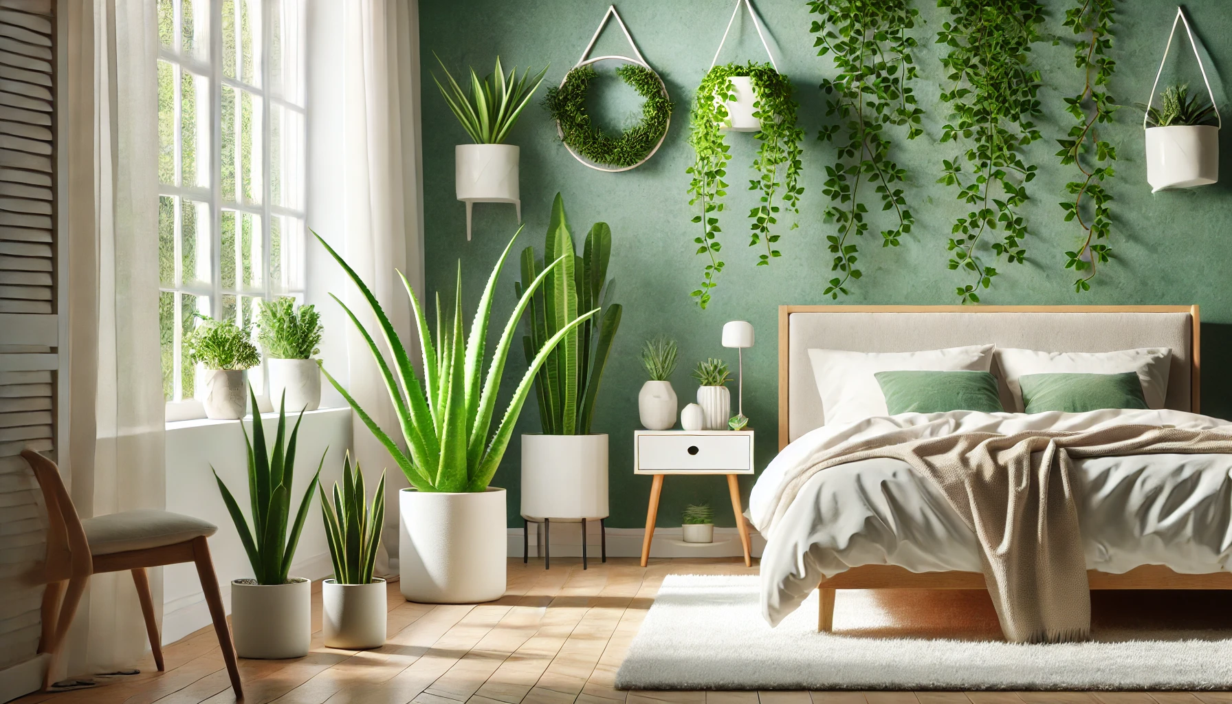 Low-light, air-purifying plants like snake plants, peace lilies, pothos, and aloe vera thrive well in bedrooms.